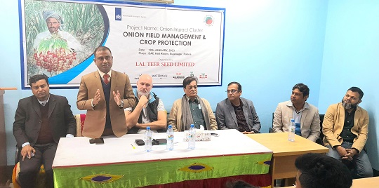 পাবনার সুজানগরে অনি অন ইমপেক্ট ক্লাস্টার প্রজেক্ট’র আওতায় পেঁয়াজের মাঠ ব্যবস্থাপনা ও ফসল রক্ষণাবেক্ষণ বিষয়ক এক কর্মশালা অনুষ্ঠিত হয়েছে। মঙ্গলবার সকালে লাল তীর সীড লিমিটেড’র উদ্যোগে এবং নেদারল্যান্ড এন্টারপ্রাইজ এজেন্সির আর্থিক সহযোগিতায় উপজেলা কৃষক প্রশিক্ষণ কেন্দ্রে অনুষ্ঠিত ওই প্রশিক্ষণে প্রধান অতিথির বক্তব্য রাখেন উপজেলা কৃষি কর্মকর্তা কৃষিবিদ রাফিউল ইসলাম। লাল তীর সীড লিমিটেড’র জেনারেল ম্যানেজার ড. আবদুর রশিদের সভাপতিত্বে অনুষ্ঠিত কর্মশালায় বিশেষ অতিথির বক্তব্য রাখেন নেদারল্যান্ড এন্টারপ্রাইজ এজেন্সির প্রতিনিধি মিঃ জেরন কুপস। এতে অন্যান্যের মধ্যে বক্তব্য রাখেন পেঁয়াজ বিজ্ঞানী ড. ফররুখ আহমেদ, জেনালে ম্যানেজার (পিডিএস) মোঃ নাছিম আকবর, বিভাগীয় ম্যানেজার মোঃ কামরুল ইসলাম, প্রজেক্ট ম্যানেজার ইমতিয়াক আলম, আঞ্চলিক ম্যানেজার (লাল তীর সীড) মনিরুজ্জামান, সহকারী ম্যানেজার (লাল তীর সীড) রফিকুল ইসলাম ও সাব্বির আহমেদ। অনুষ্ঠান সঞ্চালনা করেন লাল তীর সীড লিমিটেড’র নির্বাহী অফিসার ফিরোজ আহমেদ। কর্মশালায় পাবনা সদর ও সুজানগর উপজেলার ১৬জন পেঁয়াজ চাষী অংশ নেন।