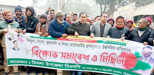 নীলফামারীর ডিমলায় বিদ্যুৎ, গ্যাস, জ্বালানী ও নিত্য প্রয়োনীয় দ্রব্য মুল্যের উর্ধগতির প্রতিবাদে উপজেলা বিএনপি’র আয়োজনে বিএনপির কার্যালয় হতে একটি বিক্ষোভ মিছিল শহরের প্রধান প্রধান সড়ক প্রদক্ষিন শেষে দলীয় কার্যালয়ে আলোচনা সভায় মিলিত হয়।