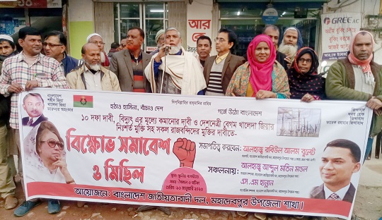 নওগাঁর মহাদেবপুর উপজেলা বিএনপির সভাপতি আলহাজ¦ রবিউল আলম বুলেট বলেছেন, মিথ্যা মামলা দিয়ে বিএনপিকে দমানো যাবেনা। মামলা হামলা দিয়ে জনতার আন্দোলন বন্ধ করা যাবেনা। সারাদেশে বিএনপির হাজার হাজার নেতাকর্মীর বিরুদ্ধে মিথ্যা বোমা বিস্ফোরণের মামলা দিয়ে আটক করা হয়েছে। কিন্তু তাদের দমানো যায়নি। তিনি বলেন, সারাদেশের মত মহাদেবপুরেও সরকারি দল নিজেরাই মিথ্যা পটকা ফুটানোর নাটক করে বিএনপি নেতাদের বিরুদ্ধে মামলা দিয়েছে। এই মামলায় উপজেলা বিএনপির সাংগঠনিক সাবেক উপজেলা ভাইস চেয়ারম্যান সম্পাদক সাজ্জাদ হোসেন, উপজেলা স্বেচ্ছাসেবক দলের নেতা এরশাদ আলী, উপজেলা যুবদলের যুগ্ম আহ্বায়ক আমিনুর রহমান, সদস্য চঞ্চল রহমান, ফায়জুল ইসলাম সবুজ ও উপজেলা ছাত্রদলের আহ্বায়ক শাকিল আহমেদ জেলে রয়েছেন। মহামান্য হাইকোর্ট তাদেরকে আগাম জামিন দিলেও জেলা জজ কোর্ট তাদেরকে জেল হাজতে নেয়। তিনি অবিলম্বে তাদের মিথ্যা মামলা প্রত্যাহার ও দেশনেত্রী বেগম খালেদা জিয়াসহ সকল রাজবন্দীর নিঃশর্ত মুক্তি দাবি করেন। সোমবার (১৬ জানুয়ারি) বিকেলে উপজেলা সদরের বাসস্ট্যান্ডে ১০ দফা দাবি আদায়, বিদ্যুতের দাম কমানো, দেশনেত্রী বেগম খালেদা জিয়া ও সকল রাজবন্দীর মুক্তির দাবিতে উপজেলা বিএনপির উদ্যোগে আয়োজিত বিক্ষোভ মিছিল ও সমাবেশে সভাপতির বক্তব্য দানকালে তিনি কথাগুলো বলেন। উপজেলা যুবদলের আহ্বায়ক কমিটির ১নং সদস্য ও প্রতিনিধি দলের সদস্য কাজী সামছুজ্জোহা মিলনের সঞ্চালনায় অন্যান্যের মধ্যে বক্তব্য দেন, সহ-সভাপতি কছিম উদ্দিন, সাধারণ সম্পাদক সাবেক ইউপি চেয়ারম্যান আলহাজ¦ আবদুল মতিন মন্ডল, সাংগঠনিক সম্পাদক এস, এম, হান্নান, উপজেলা যুবদলের যুগ্ম আহ্বায়ক কাজী আবদুস সোবহান, উপজেলা ছাত্রদলের আহ্বায়ক কমিটির ১নং সদস্য আতিকুর রহমান, জাহাঙ্গীরপুর সরকারি কলেজ শাখা ছাত্রদলের নেতা হানিফ মন্ডল প্রমুখ। এ সময় অন্যান্যের মধ্যে জেলা মহিলা দলের সহ-সভাপতি কাজী রওশন জাহান, যুগ্ম সাধারণ সম্পাদক নারগিস পারভীন, ঝরনা বেগম, সদর ইউনিয়ন বিএনপির সাধারণ সম্পাদক বাসস্ট্যান্ড বণিক সমিতির সভাপতি মনিরুল হক মনি, যুগ্ম সাধারণ সম্পাদক কিউ, এম, সাঈদ টিটো, এনায়েতপুর ইউনিয়ন বিএনপির সহ-সভাপতি মমতাজ হোসেন, সাংগঠনিক সম্পাদক মতিবুল ইসলাম লিটন, বিএনপি নেতা ফেরদৌস আলম, যুবদল নেতা শাহাদৎ হোসেন শান্ত প্রমুখ উপস্থিত ছিলেন। এর আগে দলীয় কার্যালয় থেকে একটি বিক্ষোভ মিছিল বের হয়ে বাসস্ট্যান্ডে এসে সমাবেশে মিলিত হয়।