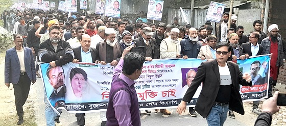 বিএনপি চেয়ারপার্সন বেগম খালেদা জিয়ার বিশেষ সহকারী এ্যাড. শামছুর রহমান শিমুল বিশ্বাস ও পাবনা-২আসনের সাবেক সংসদ সদস্য বিএনপির জাতীয় নির্বাহী কমিটির সদস্য এ্যাড. একেএম সেলিম রেজা হাবিবসহ বিএনপির কারাবন্দি সকল নেতৃবৃন্দের মুক্তির দাবিতে মঙ্গলবার পাবনার সুজানগর উপজেলা ও পৌর বিএনপির উদ্যোগে এক বিক্ষোভ মিছিল ও প্রতিবাদ সভা অনুষ্ঠিত হয়েছে। ওইদিন দুপুর ১২টায় উপজেলার মানিকদীর ঈদের মাঠ থেকে বের হওয়া বিশাল ওই মিছিলটি সুজানগর থানা এলাকায় আসলে পুলিশের বাঁধার মুখে পড়ে। পরে মিছিলটি পাবনা-সুজানগর প্রধান সড়ক প্রদক্ষিণ শেষে আবার ওই মাঠে গিয়ে এক প্রতিবাদ সভা করে। সুজানগর উপজেলা বিএনপির সাবেক সভাপতি আজম আলী বিশ্বাসের সভাপতিত্বে অনুষ্ঠিত সভায় প্রধান অতিথির বক্তব্য রাখেন পাবনা-৪ আসনের সাবেক সংসদ সদস্য ও জেলা বিএনপির সাবেক সভাপতি সিরাজুল ইসলাম সরদার। এতে অন্যানের মধ্যে বক্তব্য রাখেন জেলা বিএনপির সিনিয়র যুগ্ম আহ্বায়ক আবদুস সামাদ খান মন্টু, বিএনপি নেতা আব্দুল্লাহ আল মাহমুদ মান্নান মাস্টার, একেএম মুছা, রেহানুল ইসলাম বুলাল, আবদুল হালিম সাজ্জাদ, হাজারী জাকির হোসেন চুন্নু, জেলা যুবদলের সাবেক সাধারণ সম্পাদক মোসাব্বের হোসেন সঞ্জু, বর্তমান আহ্বায়ক ইলিয়াস আহমেদ হিমেল রানা, সুজানগর উপজেলা মহিলা বিএনপির সভাপতি হাজারী লুৎফুন্নাহার, বেড়া উপজেলা বিএনপি নেতা মনিরুজ্জামান মনি, সুজানগর উপজেলা বিএনপি নেতা আবদুল হাই খান, আহম্মদ আলী লাটু প্রামাণিক, একেএম ফিরোজ রেজা হাবিব, বুলবুল আহমেদ সবুর, আবদুস সালাম মোল্লা, মোশারফ হোসেন বাদশা, সদর উপজেলা যুবদলের আহ্বায়ক ফারুক হোসেন সুজন, জেলা স্বেচ্ছাসেবক দলের সদস্য সচিব কমল শেখ টিটু, সাবেক সাধারণ সম্পাদক মাসুদ রানা, জেলা ছাত্রদলের সাংগঠনিক সম্পাদক সাদ্দাম হোসেন, সুজানগর উপজেলা যুবদলের সদস্য সচিব রিয়াজ মন্ডল, উপজেলা স্বেচ্ছাসেবক দলের আহ্বায়ক শেখ জাকির আহমেদ, মজিবর খাঁ, পৌর যুবদলের আহ্বায়ক আনোয়ার হোসেন মোল্লা, আবুল কালাম আজাদ, কামাল শেখ প্রমুখ। অনুষ্ঠান সঞ্চালনা করেন সাবেক উপজেলা ছাত্রদল নেতা রাশেদুল ইসলাম বাবু মন্ডল। বক্তারা সরকারের কাছে অবিলম্বে মিথ্যা ও ষড়যন্ত্রমূলক মামলায় কারাবন্দি এ্যাড. শামছুর রহমান শিমুল বিশ্বাস ও এ্যাড. একেএম সেলিম রেজা হাবিবসহ কারাবন্দি বিএনপির সকল নেতৃবৃন্দের মুক্তির দাবি জানান। অন্যথায় কঠোর কর্মসূচি দেওয়া হবে বলে হুঁশিয়ারী উচ্চারণ করেন।