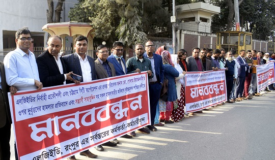 এলজিইডির নির্বাহী প্রকৌশলী ও চট্রগ্রাম সিটি কর্পোরেশনের প্রকল্প পরিচালক গোলাম ইয়াজদানির উপর জনৈক সাহাবুউদ্দিনের নেতৃত্বে ঠিকাদার নামধারী ১০/১২ জন একটি সন্ত্রাসী দলের হামলার প্রতিবাদে ও হামলা কারীদের দৃষ্টান্তমুলক শাস্তির দাবিতে মানববন্ধ করেন রংপুরে এলজিইডির কর্মকর্তা -কর্মচারীবৃন্দ।