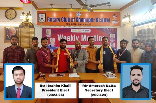 আন্তর্জাতিক যুব সংগঠন রোটার্যাক্ট ক্লাব অব চাঁদপুর সেন্ট্রাল গার্ডেনে আগামী ২০২৩-২৪ রোটাবর্ষের জন্য রোটার্যাক্ট ইব্রাহিম খলিল রিয়াদ সভাপতি এবং রোটার্যাক্ট অমরেশ দত্ত জয় সাধারণ সম্পাদক নির্বাচিত হয়েছেন।