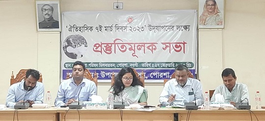 নওগাঁর পোরশায় ঐতিহাসিক ৭মার্চ দিবস উদযাপনের লক্ষ্যে প্রস্তুতিমূলক সভা অনুষ্ঠিত হয়েছে। সোমবার উপজেলা পরিষদ মিলনায়তনে অনুষ্ঠিত সভায় সভাপতিত্ব করেন ইউএনও সালমা আক্তার। এ সময় উপজেলা পরিষদ চেয়ারম্যান অধ্যক্ষ শাহ্ মঞ্জুর মোরশেদ চৌধুরী, ভাইস চেয়ারম্যান কাজীবুল ইসলাম, কৃষি কর্মকর্তা সঞ্জয় কুমার সরতার, প্রাণী সম্পদদ কর্মকর্তা ডা: আব্দুল্লাহ আল মামুন সহ কর্মকর্তাবৃন্দ উপস্থিত ছিলেন।
