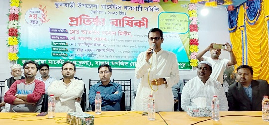 পৌরবাজারের বড় মসজিদ রোডে সাহা মার্কেটে আয়োজিত আলোচনা সভায় সভাপতিত্ব করেন গার্মেন্টস ব্যবসায়ী সমিতির সভাপতি মো. সাহাদত হোসেন। এতে সাংগঠনিক সম্পাদক বদিরুজ্জামান বাদলের সঞ্চালনায় প্রধান অতিথি হিসেবে বক্তব্য রাখেন উপজেলা পরিষদের চেয়ারম্যান মো. আতাউর রহমান মিল্টন, স্বাগত বক্তব্য রাখেন সংগঠনের সাধারণ সম্পাদক এস এম সাইফুল বারী, বিশেষ অতিথি হিসেবে বক্তব্য রাখেন পৌরসভার মেয়র আলহাজ¦ মাহমুদ আলম লিটন, বিশিষ্ট শিল্পপতি ও সমাজসেবক মো. রুহুল আমিন, পৌর কাউন্সিল আবদুল জব্বার মাসুদ, বিশিষ্ট ব্যবসায়ী অমিতাভ সরকার, উপজেলা স্বর্ণ শিল্পী সমিতির আহ্বায়ক মানিক মন্ডল, ফুলবাড়ী দোকান কর্মচারী ইউনিয়নের সভাপতি গোলাফ্ফর হোসেন ও সাধারণ সাখাওয়াত হোসেন।