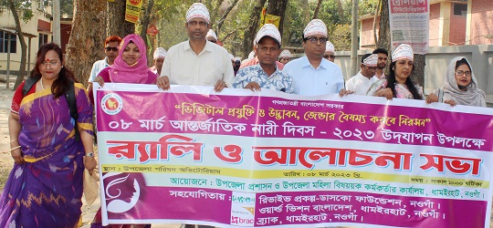 নওগাঁর ধামইরহাটে আন্তর্জাতিক নারী দিবস উপলক্ষে র্যালী ও আলোচনা সভা অনুষ্ঠিত হয়েছে। ৮ মার্চ সকাল ১০ টায় উপজেলা প্রশাসন ও মহিলা বিষয়ক অফিসের যৌথ উদ্যোগে ও রিভাইভ প্রকল্প-ডাসকো ফাউন্ডেশন, ওয়ার্ল্ড ভিশন এবং ব্র্যাক সামাজিক ক্ষমতায় ও আইনি সুরক্ষা কর্মসূচির সহযোগিতায় আন্তর্জাতিক নারী দিবস উদযাপনে একটি বর্ণাঢ্য র্যালী বের করা হয়। ব্র্যাকের পল্লী সমাজের সদস্য, কিশোরী কøাবের সদস্য, সরকারি-বেসরকারী সংগঠনের কর্মকর্তা-কর্মচারীগণ ও বিপুল সংখ্যক নারী র্যালীতে অংশগ্রহণ করেন। ‘ডিজিটাল প্রযুক্তি ও উদ্ভাবন-জেন্ডার বৈষম্য করবে নিরসন’ এই প্রতিপাদ্যকে সামনে রেখে বেলা ১১ টায় উপজেলা পরিষদ সভাকক্ষে উপজেলা নির্বাহী অফিসার মো. আরিফুল ইসলামের সভাপতিত্বে আলোচনা সভায় বক্তব্য রাখেন উপজেলা ভাইস চেয়ারম্যান মো. সোহেল রানা, মহিলা বিষয়ক কর্মকর্তা মিজানুর রহমান, উপজেলা যুব উন্নয়ন অফিসার কামরুজ্জামান সরদার, ভারপ্রাপ্ত সমাজসেবা অফিসার এ টি এম ফসিউল আলম, ডাসকো ফাউন্ডেশনের উপজেলা কর্মকর্তা রওনক লায়লা, ব্র্যাক সামাজিক ক্ষমতায় ও আইনি সুরক্ষা কর্মসূচির এসোসিয়েট অফিসার পিয়ারা খাতুন, ওয়ার্ল্ড ভিশনের কর্মকর্তা নাথন চৌকিদার, সুরভী শারমিন, উপজেলা প্রেস ক্লাবের আহ্বায়ক নুরুল ইসলাম, সিনিয়র সাংবাদিক এম এ মালেক, মহিলা আওয়ামী লীগ সাবেক সভানেত্রী আনজুয়ারা বেগম, মহিলা লীগ নেত্রী আরজিনা খাতুন প্রমুখ।