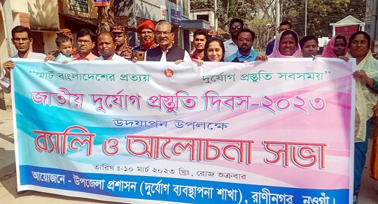 নওগাঁর রাণীনগরে জাতীয় দূর্যোগ প্রস্তুতি দিবসে র্যালী ও আলোচনাসভা অনুষ্ঠিত হয়েছে। শুক্রবার সকাল ১০টায় উপজেলা প্রশাসনের (দূর্যোগ ব্যবস্থাপনা শাখা) আয়োজনে এই অনুষ্ঠান অনুষ্ঠিত হয়। সকাল ১০টায় উপজেলা চÍবর থেকে র্যালী বের করা হয়। র্যালী শেষে আলোচনা সভা অনুষ্ঠিত হয়। সভায় উপজেলা পরিষদ চেয়ারম্যান মুক্তিযোদ্ধা আবদুর রউফ দুলু, প্রকল্প বাস্তবায়ন কর্মকর্তা মেহেদি হাসান, সদও ইউনিয়নের চেয়ারম্যান চন্দনা সারমিন রুমকি,রাণীনগর ফায়ার সার্ভিস ষ্টেশন লিডার দেলোয়ার হোসেন ও সমবায় কর্মকর্তা জাফরুল ইসলাম প্রমূখ উপস্থিত ছিলেন। সভা শেসে ফায়ার সার্ভিস ষ্টেশনের উদ্যোগে দূর্যোগ মোকাবেলায় বিভিন্ন মহরা অনুষ্ঠিত হয়।