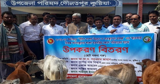 কুষ্টিয়ার দৌলতপুর উপজেলা প্রশাসন ও উপজেলা মৎস্য দপ্তরের আয়োজনে দরিদ্র জেলে পরিবারের মধ্যে বকনা গরু বিতরণ করা হয়েছে।