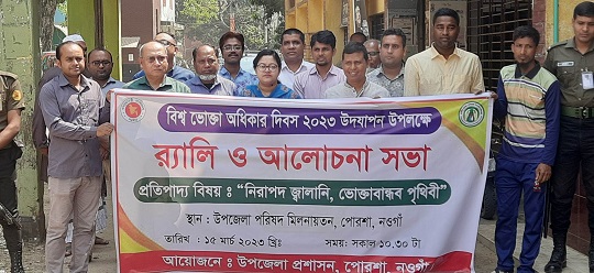 “ নিরাপদ জ্বালানী, ভোক্তাবান্ধব পৃথিবী” প্রতিপাদ্যের আলোকে নওগাঁর পোরশায় র্যালি ও আলোচনা সভার মধ্য দিয়ে বিশ্ব ভোক্তা অধিকার দিবস উদযাপন করা হয়েছে। এ উপলক্ষ্যে বুধবার উপজেলা প্রশাসনের আয়োজনে একটি র্যালি অনুষ্ঠিত হয়। এতে নেতৃত্বদেন ইউএনও সালমা আক্তার। পরে উপজেলা পরিষদ মিলনায়তনে অনুষ্ঠিত আলোচনা সভায় সভাপতিত্ব করেন ইউএনও সালমা আক্তার। এ সময় ভাইস চেয়ারম্যান কাজীবুল ইসলাম, মৎস কর্মকর্তা মনিরুজ্জামান, প্রকল্প বাস্তবায়ন কর্মকর্তা দোস্তদার হোসেন, জনস্বাস্থ্য কর্মকর্তা মিলন কুমার, পরিবার পরিকল্পনা কর্মকর্তা লুৎফর রহমান সহ কর্মকর্তাবৃন্দ উপস্থিত ছিলেন।