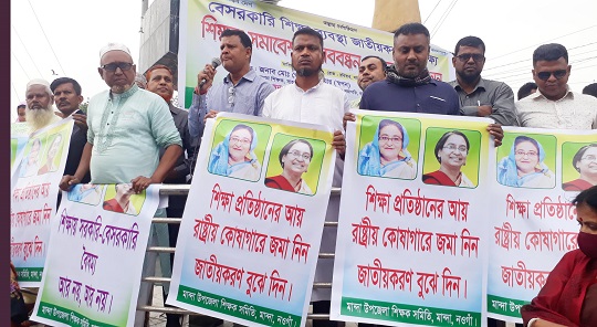 এমপিওভূক্ত শিক্ষাপ্রতিষ্ঠান জাতীয়করণের দাবিতে নওগাঁর মান্দায় সমাবেশ, মানববন্ধন ও স্মারকলিপি দিয়েছে বেসরকারি শিক্ষাপ্রতিষ্ঠানের শিক্ষকরা। রোববার দুপুরে প্রসাদপুর বাজারের চৌরাস্তার মোড়ে সমাবেশ ও মানববন্ধনের পর ইউএনওর কাছে স্মারকলিপি প্রদান করা হয়। বাশিস মান্দা উপজেলা শাখা আয়োজিত এসব কর্মসূচিতে স্কুল, কলেজ ও মাদ্রাসার শিক্ষকরা অংশগ্রহণ করেন। এতে সভাপতিত্ব করেন বাশিস মান্দা শাখার সভাপতি গোলাম সোরয়ার স্বপন। বাশিস মান্দা শাখার সাধারণ সম্পাদক অনুপ কুমার মহন্তের সঞ্চালনায় সমাবেশে বক্তব্য দেন অধ্যক্ষ আবদুস সালাম, অধ্যক্ষ মোজাফফর হোসেন, অধ্যক্ষ আবদুল গফুর, প্রধান শিক্ষক আশিষ কুমার সাহা, প্রধান শিক্ষক নাসির উদ্দিন, প্রধান শিক্ষক (ভারপ্রাপ্ত) আতিকুর রহমান মিঠু, প্রধান শিক্ষক আবদুল লতিফ মৃধা সহকারী শিক্ষক জাহাঙ্গীর আলম, সহকারী শিক্ষক হোসনে আরা মুক্তি, সুপার মিজানুর রহমান প্রমুখ।