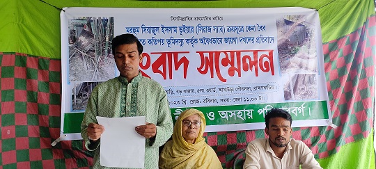 পৌর এলাকার বড় বাজারে নিজ মালিকানাধীন জায়গায় করা সংবাদ সম্মেলনে মারুফ ভূঁইয়া জানান, তার বাবা ১৯৮০ সালে ১৮ শতক জায়গা কিনলে সেখানে তারা বসবাস করছেন। তবে বিএস জরিপে ভুলবশত তাদের নামে ১৪.৮৭ শতাংশ জমি লিপিবদ্ধ হয়।