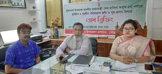 নও্রগাঁর পোরশা উপজেলা প্রশাসনের উদ্যোগে সোমবার বিকালে ইউএনও’র কার্যালয়ে প্রধানমন্ত্রী কর্তৃক ভূমিহীন ও গৃহহীন পরিবারকে ৪র্থ পর্যায়ে জমি ও গৃহ প্রদান কার্যক্রমের উদ্বোধন উপলক্ষে প্রেস ব্রিফিং অনুষ্ঠিত হয়েছে। এতে সভাপতির বক্তব্যে ইউএনও সালমা আক্তার বলেন, ২২ মার্চ এ উপজেলায় ১৫৪টি পরিবারকে ঘর ও ২ শতাংশ জমির দলিল দেওয়া হবে। এ উেপজেলায় ১ম, ২য়, ৩য় ও ৪র্থ পর্যায়ের ৩৬৩টি ঘর ইতোমধ্যে নির্মাণ কাজ সম্পন্ন করা হয়েছে। এর আগে ১ম, ২য় ও ৩য় ধাপের ঘরগুলি হস্তান্তর করা হলেও প্রধানমন্ত্রী শেখ হাসিনা ২২ মার্চ সারা দেশের সাথে এ উপজেলায় ১৫৪ টি ঘর সুবিধাভোগীদের মাঝে হস্তান্তরের উদ্বোধন করবেন। এ সময় অন্যানোর মধ্যে উপজেলা আওয়ামী লীগের সাধারন সম্পাদক মোফাজ্জল হোসেন, প্রকল্প বাস্তবায়ন কর্মকর্তা দোস্তদার হোসেন সহ উপজেলার সংবাদকর্মীবৃন্দ উপস্থিত ছিলেন।