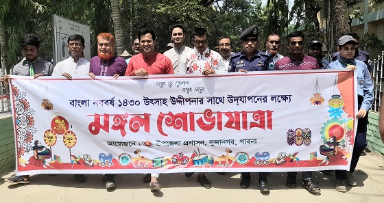 পাবনার সুজানগর উপজেলা প্রশাসনের উদ্যোগে শুক্রবার সকালে বাংলা নববর্ষ ১৪৩০ বরণ করা হয়েছে। এ উপলক্ষে বর্ণাঢ্য মঙ্গল শোভাযাত্রা, আলোচনা সভা ও মনোজ্ঞ সাংস্কৃতিক অনুষ্ঠানের আয়োজন করা হয়। সকাল ১১টায় উপজেলা পরিষদ চত্বর হতে বিভিন্ন শ্রেণী পেশার মানুষের অংশ গ্রহণে বের হওয়া মঙ্গল শোভাযাত্রাটি পৌর শহরের প্রধান প্রধান সড়ক প্রদক্ষিণ করে আবার উপজেলা পরিষদ চত্বরে গিয়ে শেষ হয়। পরে উপজেলা নির্বাহী কর্মকর্তা মোঃ তরিকুল ইসলামের সভাপতিত্বে উপজেলা পরিষদ মিলনায়তনে অনুষ্ঠিত ওই সভায় প্রধান অতিথির বক্তব্য রাখেন উপজেলা চেয়ারম্যান শাহীনুজ্জামান শাহীন। এতে বিশেষ অতিথির বক্তব্য রাখেন সুজানগর থানার অফিসার ইনচার্জ মোঃ আবদুল হান্নান। অনুষ্ঠান পরিচালনা করেন আখতারুজ্জামান জর্জ মাস্টার। শেষে মনোজ্ঞ সাংস্কৃতিক অনুষ্ঠান পরিবেশিত হয়।