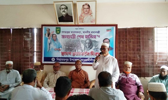 নিয়ামতপুরে প্রধানমন্ত্রী শেখ হাসিনার স্বদেশ প্রত্যাবর্তন দিবস পালন করেছে উপজেলা আওয়ামী লীগ ও অঙ্গসংগঠন। দিবসটি পালনের লক্ষে উপজেলা আওয়ামী ও অঙ্গসংগঠন বুধবার সকালে দলীয় কার্যালয়ে জাতীয় ও দলীয় পতাকা উত্তোলনের মাধ্যমে দিবসটির আনুষ্ঠানিকতা শুরু করে। পরে জাতির জনক বঙ্গবন্ধু শেখ মুজিবুর রহমানের প্রতিকৃতিতে পুস্পস্তবক অর্পণ, আলোচনা সভা ও দোয়া মাহফিলের আয়োজন করা হয়। আলোচনা সভাপতিত্ব করেন উপজেলা আওয়ামী লীগের সভাপতি আবুল কালাম আজাদ।এ সময় উপস্থিত ছিলেন উপজেলা আওয়ামী লীগের সহ-সভাপতি ও উপজেলা পরিষদের চেয়ারম্যান ফরিদ আহম্মেদ, সহ-সভাপতি সরকার কামাল উদ্দিন, নজরুল ইসলামসহ দলীয় নেতৃবৃন্দ।