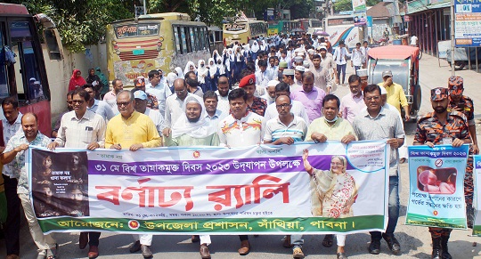 পাবনার সাঁথিয়ায় বিশ্ব তামাক দিবস উদযাপিত হয়েছে। এ উপলক্ষে উপজেলা প্রশাসনের আয়োজনে বর্ণাঢ্য র্যালী ও আলোচনা সভা অনুষ্ঠিত হয়েছে। বুধবার(৩১মে) সকাল ১১টায় র্যালী বের হয়ে উপজেলার বিভিন্ন সড়ক প্রদক্ষিণ শেষে উপজেলা পরিষদ সম্মেলন কক্ষে উপজেলা নির্বাহী অফিসার মাসুদ হোসেনের সভাপতিত্বে ও শিক্ষক শফিকুল ইসলাম রিপনের সঞ্চালনায় প্রধান অতিথি হিসাবে বক্তব্য দেন উপজেলা চেয়ারম্যান (ভারপ্রাপ্ত) সোহেল রানা খোকন।আরো বক্তব্য দেন, উপজেলা আ.লীগের সভাপতি হাসান আলী খান,মাধ্যমিক শিক্ষা কর্মকর্তা আবদুল কাদের বিশ্বাস, প্রাথমিক শিক্ষা কর্মকর্তা হেলাল উদ্দিন,প্রেসক্লাব সভাপতি মানিক মিয়া রানা, উপজেলা কৃষি কর্মকর্তা সঞ্জিব কুমার গোস্বামী, গৌরীগ্রাম ইউপি চেয়ারম্যান আবদুল ওহাব, ডাঃ আব্দুল্লাহ আল মামুন,যুব উন্নয়ন কর্মকর্তা সরোয়ার হোসেন প্রমূখ। র্যালীতে উপজেলার বিভিন্ন শিক্ষাপ্রতিষ্ঠানের শিক্ষক ও শিক্ষার্থীরা অংশ নেন।