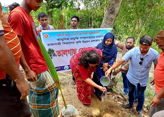 আধুনিক প্রযুক্তি সম্প্রসারনের মাধ্যমে রাজশাহী বিভাগের কৃষি উন্নয়ন প্রকল্পের আওতায় বজ্রপাতে প্রাণহানী কমাতে উপজেলার পরানপুর ও মান্দা বিল ধারে বাঁধের রাস্তায় তালগাছের এসব চারা রোপন করা হচ্ছে।