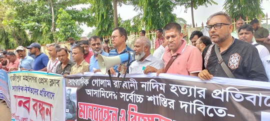 সাংবাদিক গোলাম রাব্বানী নাদিম হত্যার প্রতিবাদে এবং খুনিদের সর্বোচ্চ শাস্তির দাবীতে গাজীপুরে জেইউজিসহ ৯টি সংগঠন মানববন্ধন ও বিক্ষোভ সমাবেশ করেছে। সোমবার সকালে রাজবাড়ী রোড ডিসি অফিসের সামনে সাংবাদিক ইউনিয়ন গাজীপুর (জেইউজি) সভাপতি এইচ এম দেলোয়ারের সভাপতিত্বে ও সাধারণ সম্পাদক মোঃ হেদায়েত উল্লাহর সঞ্চালনায় এই কর্মসূচি পালিত হয়। মানববন্ধনে সংহতি প্রকাশ করে বক্তব্য রাখেন গাজীপুর জেলা টেলিভিশন সাংবাদিক ফোরাম সভাপতি ৭১ টিভি’র স্টাফ রিপোর্টার ইকবাল আহমেদ সরকার, জেইউজি নেতা এস এম হাবিবুর রহমান, কাপাসিয়া প্রেসক্লাবের সাবেক সভাপতি এফ এম কামাল হোসেন, প্রিন্সিপাল হুমায়ুন কবির, পেশাজীবী নেতা গাজীপুর মহানগর কলেজের ভারপ্রাপ্ত অধ্যক্ষ মোস্তাফিজুর রহমান খান, বাংলাদেশ সাংবাদিক নির্যাতন প্রতিরোধ সংস্থার আবু বক্কর সিদ্দিক, আবু সাঈদ চৌধুরী, মিজানুর রহমান, বাংলাদেশ কল্যাণ ফাউন্ডেশনের এম আক্তারুজ্জান, জসিম উদ্দিন প্রধান, বাংলাদেশ তৃণমূল সাংবাদিক কল্যাণ সোসাইটির আশরাফুল আলম মন্ডল, আসাদুজ্জামান তুহিন, বাংলাদেশ মফস্বল সাংবাদিক ফোরামের আবদুল হামিদ খান, নাজিম উদ্দিন, গাজীপুর মহানগর প্রেসক্লাবের শহিদুল ইসলাম, মোমিন মিয়া, গাজীপুর সদর প্রেসক্লাবের রাকিবুল হাসান আহাদ, গাছা প্রেসক্লাবের আরিফ হোসেন মৃধা প্রমুখ। এ সময় উপস্থিত ছিলেন সাংবাদিক রেজাউল বারী বাবুল, ইউনুস আলী, সিরাজুল ইসলাম তপু, দেবাশীষ রায়, নজরুল ইসলাম, জাহাঙ্গীর হোসেন, সাজ্জাকুল ইসলাম রাজ্জাক, জি এম জয়, নুপুর আক্তার, সুমা আক্তার লুবনা, কামাল শেখ, এলিজা পারভীন লিজা, আনিসুর রহমান, জুম্মুন খান, আলমগীর কবিরসহ প্রিন্ট ও ইলেক্ট্রনিক মিডিয়ার বিপুল সংখ্যক সাংবাদিক। নেতৃবৃন্দ গোলাম রাব্বানী নাদিমসহ সকল সাংবাদিক হত্যার বিচার, ডিজিটাল নিরাপত্তা আইন বাতিল এবং সকল বন্ধ মিডিয়া অবিলম্বে খুলে দেয়ার দাবী জানান।