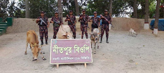 নওগাঁর পোরশা সীমান্তে ১৬ বিজিবি’র বিশেষ অভিযান পরিচালনা করে ভারতীয় ৩ টি গরু আটক করেছে। শনিবার দিবাগত রাত আনুমানিক সাড়ে ৩টায় গরুগুলি আটক করা হয়। ১৬ বিজিবি’র অধিনায়ক মোহাম্মদ আসাদুজ্জামান পিএসসি’জি জানান, আরআইবি সদস্যের তথ্যের ভিত্তিতে নীতপুর বিওপির জেসিও-৮৭৭১ সুবেদার আলমগীর হোসেন এর নেতৃত্বে বিওপি হতে আনুমানিক ৪ কিঃ মিঃ উত্তর পশ্চিম কোণে এবং সীমান্ত পিলার ২৩১/এমপি হতে আনুমানিক ৪০০ গজ বাংলাদেশের অভ্যন্তরে ইব্রাহিমের ভাঁটা নামক স্থানে(জিআর-৪৩২৮১৫ এমএস ৭৮সি/৮) এ্যাম্বুশ করা হয়। এ সময় টহল দলের উপস্থিতি টের পেয়ে ৩ জন চোরাকারবারী তাদের নিকট থাকা ভারতীয় গরুগুলি ছেড়ে দিয়ে ভারতের দিকে পালিয়ে যায়। পরে টহল দল ওই স্থান হতে ভারতীয় ৩টি গরু ক্যাম্পে নিয়ে আসে। যার আনুমানিক সিজার মূল্য ৩ লক্ষ ২৫ হাজার টাকা। আটককৃত ভারতীয় গরুগুলি নজিপুর কাস্টমসে জমা দেওয়ার কার্যক্রম প্রক্রিয়াধীন রয়েছে বলে তিনি জানান।