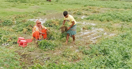 বাদাম তোলার কাজ করছিলেন দুজনেই। দুলাল হোসেন কাদাপানিতে সয়লাব ক্ষেত থেকে বাদামের গাছ টেনে উপড়িয়ে তুলে জমা করছিলেন ক্ষেতেরই এক কোণে। আর তার স্ত্রী জান্নাতুন ফেরদৌস বিথি সেগুলোর গোড়া থেকে থরে থরে ধরে থাকা বাদাম খুলে খুলে রাখছিলেন। বিথি জানালেন, শুরু থেকে তারা দুজনেই কাজ করেছেন এই বাদাম ক্ষেতে। সে এক নতুন অভিজ্ঞতা। বিছন তৈরি, জমি চাষ, জমিতে উঁচু উঁচু সুলি তৈরি, বাদাম গাছ লাগানো সব কিছুই করেছেন দুজনেই। নতুন ফসল জন্য খুব উৎসাহ নিয়ে কাজ করেছেন তারা। তবে বৃষ্টির পানি জমে থাকায় বাদাম তুলতে কয়েকজন নারী শ্রমিক নিয়েছিলেন। তারা একদিন কাজ করেছেন। কিন্তু তারা দুজনে যে দরদ দিয়ে কাজ করেন অন্য শ্রমিকেরা তা করেন না। তাই আবার দুজনেই শুরু করেছেন।