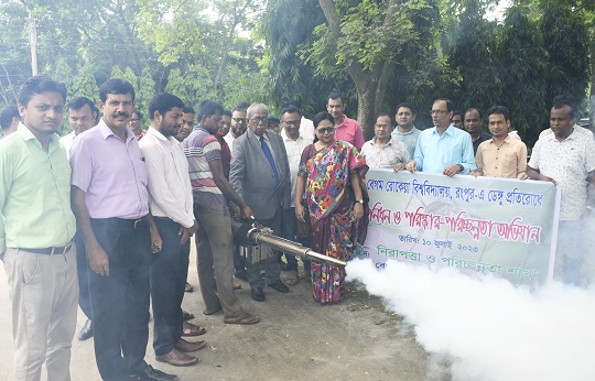 বেগম রোকেয়া বিশ্ববিদ্যালয়, রংপুরে ডেঙ্গু প্রতিরোধে মশক নিধন ও পরিস্কার পরিচ্ছন্নতা কার্যক্রম পরিচালিত হয়েছে। নিরাপত্তা ও পরিচ্ছন্নতা শাখার আয়োজনে সোমবার (১০ জুলাই, ২০২৩) বিশ্ববিদ্যালয়ের প্রশাসনিক ভবনের সামনে এ কার্যক্রমের আনুষ্ঠানিক উদ্বোধন করেন উপাচার্য প্রফেসর ড. মোঃ হাসিবুর রশীদ। কর্মসূচি উদ্বোধনকালে উপাচার্য বলেন, এডিস মশার বিস্তার রোধে সবাইকে সচেতন হতে হবে। পুরো ক্যাম্পাস পরিস্কার-পরিচ্ছন্ন রাখতে সবার প্রতি আহবান জানান তিনি।