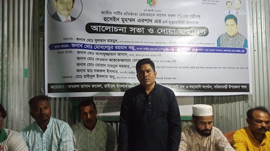 এ উপলক্ষে শুক্রবার (১৪ জুলাই) বিকেলে জাতীয় পার্টির কেন্দ্রীয় নির্বাহী কমিটির সদস্য ও জেলা জাতীয় পার্টির যুগ্ম সাধারণ সম্পাদক মোখলেছুর রহমান বস্তুর উদ্যোগে দোয়া ও আলোচনা সভা অনুষ্ঠিত হয়। এ সময় জাতীয় পার্টির এমপি প্রার্থী সাবেক ছাত্রনেতা মোখলেছুর রহমান বস্তু প্রধান অতিথির বক্তব্য রাখেন।