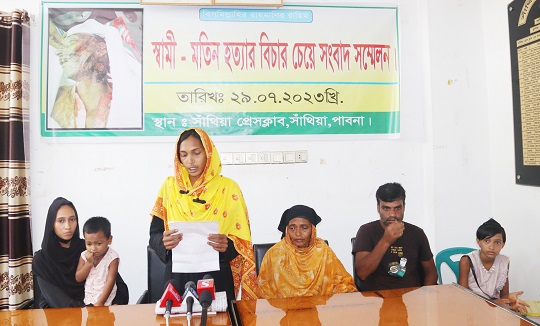 সংবাদ সম্মেলনে নিহত মতিনের স্ত্রীর পক্ষে তার বড় মেয়ে সবিতা খাতুন লিখিত বক্তব্য পাঠ করে জানান,গত বছর ৪জুন(২০২২) বিকেলে উপজেলার নাগডেমরা ইউপি সাবেক চেয়ারম্যান হারুন অর রশিদের ছোট ভাই জুয়েল রানা আমার স্বামীকে জুয়েলের মেয়ের বাড়ি বেড়ানোর কথা বলে ডেকে নিয়ে যায়। ওই দিন রাত সারে ৮টার দিকে ফেরার পথে জুয়েল কৌশলে পাকা সড়ক দিয়ে না এসে ফেঁচুয়ান গ্রামের নদী পার হয়ে অন্ধকারে ফাঁকা জায়গা দিয়ে পুটিপাড়া দহ এর সড়ক দিয়ে নিয়ে গিয়ে সে জুয়েল ও তার ভারাটিয়া সন্ত্রাসীদের দিয়ে আমার স্বামীকে খুন করান। নিজের দোষ ঢাকতে ও অন্য লোককে ফাঁসানোর জন্য তার শরীরে অঘাতের আঁচড় লাগান। হারুন চেয়ারম্যান রাজনৈতিক সুবিধা নেওয়ার জন্য তার প্রতিপক্ষ বর্তমান চেয়ারম্যান হাফিজুর রহমানকে প্রধান আসামি করে। হারুন আমাকে বা আমার পরিবারের কোন লোককে বাদী না করে নিজে বাদী হয়ে ১৯জনকে আসামি করে মামলা করেন। পরবর্তীতে মামলাটি থানা পুলিশ হতে পাবনা সিআইডি পুলিশ তদন্ত শুরু করেন।সিআইডি পুলিশ পরিদর্শক (নিরস্ত্র) পায়েল হোসেন তদন্ত করে মামলার বাদী হারুন চেয়ারম্যানের ছোট ভাই জুয়েল রানা সহ ৩/৪জনকে গ্রেপ্তার করে। গ্রেপ্তারকৃতদের ফৌজদারি কার্যবিধ ১৬৪ ধারা মোতাবেক স্বীকারোক্তিমূলক জবান বন্দী গ্রহন করে এবং গ্রেপ্তা কৃত জুয়েলকে নিয়ে ঘটনাস্থল থেকে হত্যার কাজে ব্যবহৃত ছোড়া, হাসুয়া, রামদা, ডেগার উদ্ধার করে সিআইডি পুলিশ। সিআইডি পুলিশ পরিদর্শক পায়েল হোসেন এবং পরবর্তীতে মামলাটির তদন্তকারী কর্মকর্তা এসপি মাহাবুব হোসেন মামলার তদন্ত শেষ করতে পারেননি। দীর্ঘ এক বছর পেরিয়ে গেলেও মতিন হত্যার প্রকৃত খুনিদের অর্থের বিনিময়ে আড়াল করার অভিযোগ উঠেছে তদন্তকারী কর্মকর্তার বিরুদ্ধে। মামলার বর্তমান তদন্তকারী কর্মকর্তা মামলাটিকে ভিন্নখাতে প্রবাহের চেষ্টা করছেন। আমার স্বামীর প্রকৃত খুনিরা এখনও ধরা ছোয়ার বাইরে রয়ে গেছে।
