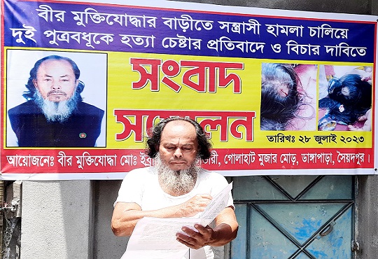 সংবাদ সম্মেলনে লিখিত বক্তব্যে তিনি জানান, আবদুল কাইয়ুম ও শেখ নাসিম নামে দুই জনের কাছ থেকে তিনি ২২১১ সালে বাড়ীসহ কিছু জমি ক্রয় করেন। এরপর থেকে তিনি ওই বাড়ীতে পরিবার নিয়ে বসবাস করে আসছেন। হঠাৎ করে বাড়ী যাতায়াতের রাস্তাটি নিজের দাবী করে গত ২২ জুলাই এলাকার আরিফ হোসেন, হাবিব হোসেন, আজিজ এবং মনোয়ারা বেগম লাঠি সোটা নিয়ে তাদের ওপর অতর্কিত হামলা চালায়। এ সময় গুরুতর আহত হন মুক্তিযোদ্ধার দুই পুত্রবধু নাসরিন ও খাদিজা। তাদের উভয়ের মাথায় আঘাতের ফলে রক্তক্ষরণ হলে ভর্তি করা হয় রংপুর মেডিকেল কলেজ হাসপাতালে। বর্তমানে তারা সেখানে চিকিৎসাধীন রয়েছে।