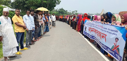 পাবনার সুজানগরে চিত্রা রানী ভৌমিক নামে এক সরকারি কর্মচারীর প্রতারণার বিরুদ্ধে মানববন্ধন অনুষ্ঠিত হয়েছে। বৃহস্পতিবার সকালে উপজেলার কাদোয়া সরকারি কমিউনিটি ক্লিনিকের স্বাস্থ্যসেবা কর্মী এবং কাদোয়া গ্রামের আশীষ কুমার ভৌমিকের স্ত্রী ওই চিত্রা রানীর বিরুদ্ধে এই মানববন্ধন করেছে এলাকাবাসী। ওইদিন সকাল ১১টায় সুজানগর-বোনকোলা প্রধান সড়কের কাদোয়া বাজারে অনুষ্ঠিত ওই মানববন্ধনে এলাকার শত শত নারী-পুরুষ অংশ নেয়। মানববন্ধনে বক্তব্য রাখেন আবদুল ওহাব, আবদুস শুকুর, আবদুল ফাত্তার প্রামাণিক, প্রশান্ত কুমার চক্রবর্তী, মনসুর আলী ও শাহজাহান সিরাজ। বক্তারা বলেন ওই চিত্রা রানী, একজন প্রতারক, ফাঁকিবাজ, দুর্নীতিবাজ এবং ধোকাবাজ। সে কখনো নিয়মিত অফিস করেনা, সরকারি ঔষধপত্র টাকার বিনিময়ে বাইরে বিক্রি করে এবং অফিসে আসা সেবা গ্রহীতাদের সাথে অসৌজন্যমূলক আচরণ করে। বক্তারা আরো বলেন ওই চিত্রা রানী এলাকার একাধিক লোকজনের কাছ থেকে সরকারি চাকরি দেওয়ার নাম করে মোটা অংকের টাকা আত্মসাৎ করেছে। পাশাপাশি সে এলাকার অগণিত লোকজনের কাছ থেকে টাকা পয়সা ধার নিয়ে সেই টাকা আর ফেরত দেয় না। উপরন্ত পাওনাদাররা তার কাছে ওই টাকা চাইলে সে তাদের সাথে খারাপ ব্যবহার করার পাশাপাশি মিথ্যা অপবাদ দিয়ে মামলা করার হুমকি দেয়। সে কারণে তারা পাওনা টাকা চাওয়ার সাহস পায়না। এলাকাবাসী তার বিরুদ্ধে আইনানুগ ব্যবস্থা নিতে সংশ্লিষ্ট কর্তৃপক্ষের হস্তক্ষেপ কামনা করছেন।