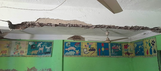 জানা যায়, রোববার সকাল সাড়ে ৯টার দিকে সহকারী শিক্ষক মোকাদ্দেস আলী পঞ্চম শ্রেণির ক্লাস নেওয়ার জন্য শ্রেণি কক্ষে প্রবেশ করেন। এ সময় দীর্ঘদিনের জরাজীর্ণ ওই বিদ্যালয় ভবনের ছাঁদ ধসে তার গায়ের ওপর পড়ে। এতে সে মারাত্মভাবে আহত হয়। তবে শিক্ষার্থীরা অক্ষত রয়েছে। বিদ্যালয়ের প্রধান শিক্ষক মাহফুজা খাতুন জানান, ১৯৭২সালে ওই বিদ্যালয়টি প্রতিষ্ঠিত হয়। প্রতিষ্ঠা লগ্নে টিনের ঘরে বিদ্যালয়ের কার্যক্রম পরিচালনার একপর্যায়ে ১৯৯৩সালের দিকে ওই ভবন নির্মিত হয়। দীর্ঘদিন আগে নির্মিত ওই ভবনের বিভিন্ন জায়গা থেকে পলেস্তারা খসে রোড বের হয়ে যাওয়ার পাশাপাশি ফাটল ধরেছে। যে কোন মুহূর্তে ভবনটি ধ্বসে পড়ে বড় ধরনের দুর্ঘটনা ঘটতে পারে। কিন্তু তার পরও বিকল্প কোন ভবন না থাকায় ঝুঁকিপূর্ণ ওই ভবনেই পাঠদান করতে হচ্ছে। এ ব্যাপারে উপজেলা শিক্ষা কর্মকর্তা মোঃ আবদুল জব্বার বলেন ওই বিদ্যালয়ে নতুন ভবন নির্মাণের বিষয়ে সংশ্লিষ্ট কর্তৃপক্ষকে অবহিত করা হয়েছে। হয়তো শিগগিরই নতুন ভবন নির্মিত হবে।