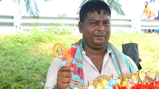 এই মাল নিবেন, হরেক রকমের মেয়ে ও ছোট বাচ্চাদের খেলনা ও খোপার টুপি আছে। সকাল হলেই প্রতিদিন নাওয়া খাওয়া সেরে কখনো বা না খেয়েই নাটোর আব্দুলপুর থেকে ট্রেন যোগে আত্রাই আসে। আত্রাই এসে শুরু হয় বিভিন্ন স্কুল- মাদ্রাসা, বাজার গুলোতে নিজে পায়ে হেঁটে ছুটে চলেন রাজিব মিঞা। হাতের উপর একটি ডালাতে সাজিয়ে তার হাতের তৈরি করা ভ্রাম্যমান দোকানে তিন্য প্রয়োজনীয়, হরেক রকমের মেয়েদের খোঁপার টুপি ও ছোট বাচ্চাদের খেলনা ফেরি করে বিক্রি করেন তিনি, তার ভ্রাম্যমান দোকানে পাওয়া যায় ঐসব জিনিষপত্র প্রায় দশ প্রকারের জিনিস। তিনি ঢাকা চকবাজার থেকে মেয়েদের খোঁপার টুপি, কানের দুল,ছোট বাচ্চাদের খেলনার সরমঞ্জাদি কিনে থাকেন এবং নিজে ও পরিবারের সদস্যরা তৈরি করেন। রাজিব মিঞা জানান, বছর পাঁচেক আগে কৃষিকাজে শ্রমিকের কাজ করতেন তিনি। এত তিনি পুঁশিয়ে ওঠতে না পেরে ছেড়ে দেন কৃষি শ্রমিকের কাজ। বসে না থেকে আরম্ভ করেন নতুন ব্যবসা। তার কথায়“ হরেক রকমের মেয়ে ও ছোট বাচ্চাদের খেলনা ও খোপার টুপি” তিনি বিক্রি করেন। তিনি পার্শ্ববতী নাটোর জেলার আবদুল পুর উপজেলায় তার বাড়ি। দুই মেয়ে দুই ছেলে স্থানীয় সররকারি প্রথমিক বিদ্যালয়ে পড়াশুনা করে। কিছুদিন কৃষি কাজের দিন মজুরের কাজ করেছি, তার বিভিন্ন তরিতরকারি বেচা -বিক্রি করি, সেখানে পুষাতে না পেরে পাঁচ বছর ধরে আত্রাই উপজেলায় বিভিন্ন হাট -বাজারে ফেরি করে বেড়াই। তিনি আরো জানান এ ব্যবসয় বেচাকেনা ভালোই হয়। তার অধিকাংশ ক্রেতাই গ্রামের মহিলা, যারা কেনাকাটার জন্য বাজারে যায় না তারাই তার কাছ থেকে নানা প্রকার মেয়েদের সাজনির ও বাচ্চাদের খেলনাপত্র কিনে থাকেন। অন্যন্য ব্যবসার মতো তাকেউ খরিদ্দারদের বাঁকি দিতে হয়। তবে তিনি পরিচিত খরিদ্দারদের চিনে বাঁকি দিতে হয়। যাদের লেনদেন ভালো দাদেরকে বাঁকি দিতে তিনি কাপণ্য করেন না। তিনি আত্রাই উপজেলার বিভিন্ন গ্রামে -স্কুল -কলেজে ফেরি করতে যান। একই গ্রামে বা একই বাজারে প্রতিদিন যান না। অন্তত এক সপ্তাহ পর পর এক স্থানে যান না। এত বিক্রি ভালো হয়। বাড়ি থেকে সকালে খাবার সঙ্গে নিয়ে যান। বেলা হলেই কোথাও একটু বসে জিরিয়ে নিয়ে দুপুরের খাবার সেরে নেন। এ ব্যবসায় তার প্রতিদিন চারশত থেকে পাঁচ শত টাকা আয় হয়। বিশেষ করে দুই ঈদ ও পূজার সময় তার বেচাকেনা সব চেয়ে বেশিহয়। তিনি জানালেন সংসারে মা-বাবা,স্ত্রী ও চার সন্তান নিয়ে এখন তার দিন ভালোই কাটছে।