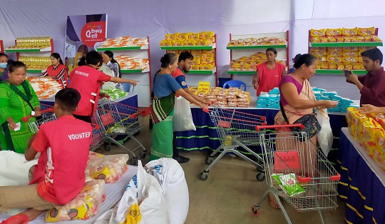 রাঙ্গামাটিতে পাহাড় ধস ও বন্যায় ক্ষতিগ্রস্থ নিম্ন আয়ের মানুষের জন্য পাঁচ টাকায় বাজারের আয়োজন করেছে বিদ্যানন্দ ফাউন্ডেশন। যেই বাজারে ১০ টাকা দিয়ে মুরগি, মাছ, চাল, তেল, ডাল, আটা, সুজি, লুঙ্গি, আলু, পেয়াঁজ, খাতা ব্যাগ, ছাতাসহ প্রায় ১৯ রকমের প্রয়োজনীয় পণ্য কিনতে পারছে।