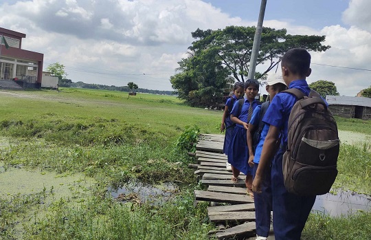 ঝিনাইদহ কালীগঞ্জ জহুরা খাতুন সরকারি প্রাথমিক বিদ্যালয়ে যাতায়াতের কোনো রাস্তা না থাকায় ভোগান্তিতে পড়ছেন শিক্ষক ও শিক্ষার্থীরা। গ্রামের ধানক্ষেতের সরু আইলই সেখানে যাতায়াতের একমাত্র পথ। এতে প্রাথমিক শিক্ষা কার্যক্রম মারাত্মক ভাবে ব্যাহত হচ্ছে। সংশ্লিষ্টরা জানান, ২০১৬ সালে বাকুলিয়া গ্রামের বিলের মধ্যে জহুরা খাতুন সরকারি প্রাথমিক বিদ্যালয় স্থাপিত হয়। বর্তমানে সব শ্রেনী মিলিয়ে শিক্ষার্থী সংখ্যা ৭৬ জন। বিদ্যালয়ের তিন পাশেই ধানক্ষেত। আরেক পাশে রয়েছে ঢাকা খুলনা মহাসড়ক। প্রাথমিক বিদ্যালয়টিতে শিশুদের যাতায়াতের জন্য এখনও পর্যন্ত কোনো রাস্তা তৈরি হয়নি। ফলে তাদের যাতায়াতের জন্য শ্রেনী প্রধান সড়ক একপি ডোবার উপরে কাঠের ও বাঁশ দিয়ে চলাচল করছে। কালীগঞ্জ পৌরসভার২ নং ওয়ার্ড বাকুলিয়া গ্রামের বিলের মধ্যে একটি প্রাথমিক বিদ্যালয় রয়েছে। জহুরা খাতুন সরকারি প্রাথমিক বিদ্যালয়টি প্রতিষ্ঠার পর থেকেই যাতায়াতের কোন রাস্তা নেই। রাস্তা না থাকার কারণে শিক্ষার্থীরা স্কুলে যেতে চায় না। বিদ্যালয়ের এক শিক্ষার্থরি মা বলেন, রাস্তা না থাকায় বাচ্চারা স্কুলে যেতে চায় না। বাচ্চাকে স্কুলে পাঠিয়ে দুশ্চিন্তায় থাকি, কখন যে কাঠের উপর থেকে পড়ে যায়।এ জন্য মাঝে মধ্যে স্কুলে গিয়ে বাচ্চার জন্য বসে থাকতে হয়। বিদ্যালয়ের প্রধান শিক্ষক পারভীন খান বলেন, রাস্তা না থাকায় অনেক ভোগান্তি হয়। স্কুলে ছাত্র-ছাত্রীরা আসতে চায় না। অভিভাবকরা বাচ্চাদের দিতে চান না। বর্ষা মৌসুমে আরো বেশি সমস্যা হয়। জমির আইল দিয়ে আসতে গিয়ে বইখাতা ভিজে যাওয়ারও ঘটনাও ঘটছে। শুরুর দিকে প্রায় ১০০ জন ছাত্র-ছাত্রী ছিল। এখন সব শ্রেনী মিলিয়ে পড়ে ৭৬ জন। রাস্তা না থাকার কারণে বিদ্যালয়ের অবকাঠামো উন্নয়নও হচ্ছে না। দুর্ভোগের কথা বারবার জানানো হলেও সংশ্লিষ্ট কর্তৃপক্ষ প্রয়োজনীয় ব্যবস্থা নিচ্ছে না। এ কারণে দিন দিন ওই বিদ্যালয়ের ছাত্র-ছাত্রী কমে যাচ্ছে। বিশেষ করে বিদ্যালয়ের পড়-য়া কোমলমতি শিক্ষার্থীদের প্রতিদিন জীবনের ঝুঁকি নিয়ে মেঠো পথ ধরে দুইটি কাঠের ভাঙা ছোট কাঠ ও বাঁশ দিয়ে চলাচলের রাস্তার উপর দিয়ে স্কুলে যাওয়া আসা করতে হয় বছরের পর বছর।বিদ্যালয়টি বাকুলিয়া/ শ্রীরামপুর সড়ক থেকে প্রায় ৫০০ গজ দূরে বিলের মধ্যে অবস্থিত। প্রাক প্রাথমিক থেকে শুরু করে পঞ্চম শ্রেনী পর্যন্ত মোট ৭৬ জন শিক্ষার্থী এখানে নিয়মিত পাঠ গ্রহন করছে। এ বিদ্যালয়ে ৫ জন শিক্ষক কর্মরাত থেকে পাঠদান করাচ্ছেন।বিলের মধ্যে ২০১৬ সালে ৩৩ শতাংশ জমির উপর ৩ টি শ্রেনী কক্ষ ও ১ টি অফিস কক্ষের ১ তলা ভবন নির্মীত হলেও আজ পর্যন্ত স্কুলে যাওয়ার জন্য কোন রাস্তা নির্মাণ হয়নি। বছর জুড়ে স্কুলের চত