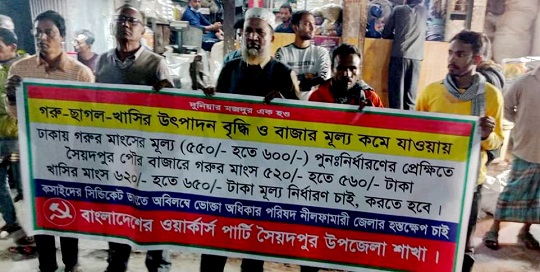 নীলফামারীর সৈয়দপুরে গরু, ছাগল ও খাসির মাংসের দাম বাড়িয়ে দিয়ে বিক্রি করছে ব্যবসায়িরা। মাংস ব্যবসায়িদের সিন্ডিকেট থাকায় তারা কৌশলগতভাবে দাম বেশী নিচ্ছে। সরকার নির্ধারিত মুল্যের চেয়ে তারা বেশী দামে মাংস বিক্রি করে আসছে দীর্ঘদিন থেকে। দীর্ঘদিনের এমন অভিযোগ ক্রেতাদের। গরু, ছাগল ও খাসির মাংসের দাম বেশী নেয়ার প্রতিবাদে বাংলাদেশের ওয়ার্কার্স পাটি সৈয়দপুর উপজেলা শাখার পক্ষ থেকে প্রতিবাদ সভা করা হয়। সেই সাথে ছাগল ও খাসির মাংসের কেজি ৬শ টাকা থেকে ৬শ ৮০ টাকা এবং গরুর মাংসের কেজি ৫শ ২০ টাকা থেকে ৫শ ৬০ টাকা মুল্য নির্ধারণের দাবি জানিয়ে নীলফামারী জেলা প্রশাসক বরাবর আবেদন করা হয়। আবেদনের অনুলিপি দেয়া হয় বিভাগীয় কমিশনার রংপুর, জেলা পুলিশ সুপার, ভোক্তা অধিকার পরিষদ, সৈয়দপুর উপজেলা নির্বাহী কর্মকর্তা ও সৈয়দপুর পৌর মেয়রকে। এদিকে গরু, খাসি ও ছাগলের মাংসের দাম বেশী নেয়ার প্রতিবাদে শহরের বঙ্গবন্ধু চত্বরে, চৌধুরী টাওয়ার ও মদিনা মোড়ে পথ সভা করে ওই রাজনৈতিক দলটি। সোমবার ৪ ডিসেম্বর রাতে ওই পথ সভায় বক্তব্য বলেন, নীলফামারী জেলা কমিটির সদস্য কমরেড তোফাজ্জল হোসেন, ছাত্র মৈত্রীর নেতা মেহেদী হাসান, কেন্দ্রীয় বিকল্প সদস্য ও সৈয়দপুর উপজেলা কমিটির সাধারণ সম্পাদক রুহুল আলম মাস্টার, কমরেড মজিবর রহমান, আরমান আলী ও কমরেড আশরাফুল আলমসহ অনেকে। সৈয়দপুর মাংস ব্যবসায়ি সমিতির সভাপতি নাদিম হোসেন বলেন, বাজারে গরু ও ছাগলের দাম চড়া। তাই দামের ওপরে আমরা কেজি দাম নির্ধারণ করে থাকি। বর্তমানে আমরা খাসির মাংস বিক্রি করছি ৮২০ টাকা কেজি। ছাগলের মাংসের কেজি ৭২০ টাকা আর গরুর মাংসের কেজি বিক্রি করছি ৬শ টাকা দরে। যদি হাটে পশুর দাম কমে যায় তাহলে মাংসের দামও অটোমেটিক কমে যাবে। এখানে কোন ধরনের কারসাজি বা সেন্ডিকেট কাজ করে না।