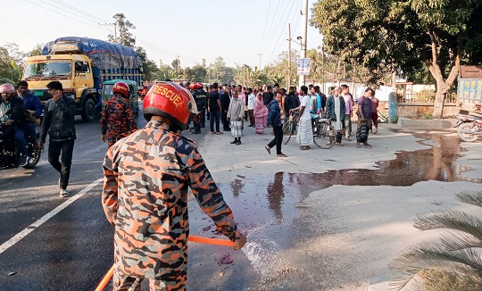 দিনাজপুরের ফুলবাড়ীতে ট্রাকের ধাক্কায় ঘটনাস্থলেই মোটরসাইকেল আরোহী মমিনুল ইসলাম (৩৮) নিহত এবং সঙ্গী বোন জামাতা আবু তাহের (৫২) গুরুতর আহত হয়েছেন। ঘটনাটির সত্যতা নিশ্চিত করেছেন ফুলবাড়ী থানার অফিসার ইনচার্জ (ওসি) মোস্তাফিজার রহমান। ঘটনাটি ঘটেছে, শুক্রবার (২৯ ডিসেম্বর) দুপুর আড়াইটার দিকে দিনাজপুরের ফুলবাড়ী-গোবিন্দগঞ্জ আঞ্চলিক মহাসড়কের ফুলবাড়ী উপজেলার জয়নগর শর্মিলী পেট্রোল পাম্পের সামনের সড়কে। নিহত মমিনুল ইসলাম ফুলবাড়ী উপজেলার খয়েরবাড়ী ইউনিয়নের লালপুর গ্রামের মৃত নবিউল ইসলামের ছেলে এবং উপজেলা প্রাণিসম্পদ দপ্তরের ডেইরী উন্নয়ন প্রকল্পের লাইভস্টোক সার্ভি প্রোভাইডার (এলএসপি) পদের মাঠকর্মী পদে কর্মরত ছিলেন। প্রত্যক্ষদর্শীরা জানান, মমিনুল ইসলাম পার্শ্ববর্তী বিরামপুর উপজেলায় তার বড় বোনের বাড়ী থেকে বোন জামাতা আবু তাহেরকে সঙ্গে নিয়ে নিজ মোটরসাইকেল যোগে নিজ বাড়ী ফুলবাড়ীতে ফেরার পথে ফুলবাড়ী-গোবিন্দগঞ্জ আঞ্চলিক মহাসড়কের ফুলবাড়ী উপজেলার জয়নগর শর্মিলী পেট্রোল পাম্পের সামনের সড়কে একটি দ্রুতগামী ট্রাক মোটরসাইকেলকে পিছন থেকে ধাক্কা দেয়। এতে সঙ্গীসহ মমিনুল ইসলাম মোটরসাইকেল নিয়ে সড়কের ওপর ছিটকে পড়লে ট্রাক তাকে চাপা দিয়ে ফুলবাড়ীর দিকে পালিয়ে যায়। খবর পেয়ে ফুলবাড়ী ফায়ার সার্ভিসের সদস্যরা ঘটনাস্থল থেকে মরদেহ উদ্ধার করেন। ফুলবাড়ী থানার অফিসার ইনচার্জ (ওসি) মোস্তাফিজার রহমান বলেন, আইনি প্রক্রিয়া শেষে মরদেহ পরিবারের কাছে হস্তান্তর করা হয়েছে। ট্রাকটিকে আটকের চেষ্টা চলছে। এ ঘটনায় ভুক্তভোগী পরিবারের পক্ষ থেকে মামলা দায়ের করলে আইনি ব্যবস্থা নেয়া হবে।