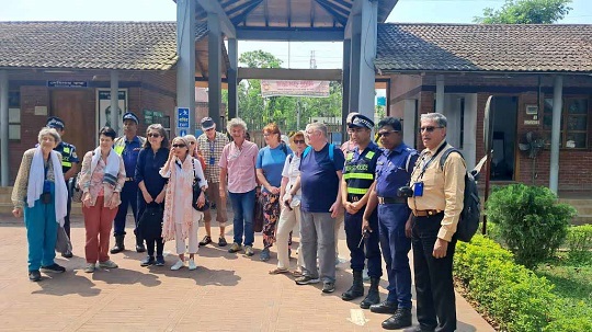 বাগেরহাটের বিশ্ব ঐতিহ্য ষাটগম্বুজ মসজিদ ঘুরে গেলেন সুইডেন-জার্মানের ২০ পর্যটক। শুক্রবার (২২ মার্চ) সকালে মোংলা থেকে সড়ক পথে ষাটগম্বুজ মসজিদে আসেন বিদেশী পর্যটকরা। দীর্ঘক্ষন ষাটগম্বুজ মসজিদ, ঘোড়া দিঘী ও আশপাশের প্রাচীন স্থাপনা ঘুরে দেখে পুনরায় সড়ক পথে মোংলায় ফেরেন তারা। মুসলিম স্থাপত্যের অনন্য নিদর্শন প্রাচীণ এই স্থাপনা দেখে আনন্দ প্রকাশ করেন বিদেশীরা। এর আগে বৃহস্পতিবার (২১ মার্চ) বিকেলে ভারতীয় বিলাসবহুল প্রমোদতরী এম ভি গঙ্গা বিলাসে মোংলা বন্দর এলাকায় পৌছায় এই বিদেশী পর্যটকরা। তারা সুন্দরবনের করমজলসহ বিভিন্ন এলাকা ভ্রমন করেন। বিদেশী দর্শনার্থীদের মধ্যে সুইডেনের ১৫ এবং জার্মানের ৫ জন নাগরিক রয়েছে। বাগেরহাট টুরিস্ট পুলিশের ওসি নুরুল ইসলাম বলেন, যথাযথ নিরাপত্তার মধ্য দিয়ে বিদেশী পর্যটকরা ষাটগম্বুজ ভ্রমন করেছেন। সড়ক পথে মোংলা পৌছে, আজকেই প্রমদতরী গঙ্গা বিলাসে নদী পথে খুলনার আংটিহারা এলাকায় ইমিগ্রেশন শেষ করবেন বিদেশীরা। সকল প্রক্রিয়া শেষে তারা ভারতের উদ্দেশ্যে বাংলাদেশী জলসীমা ত্যাগ করবেন বলে জানান এই কর্মকর্তা।