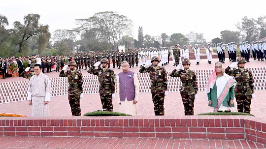 মহান স্বাধীনতা ও জাতীয় দিবস উপলক্ষে সাভারে জাতীয় স্মৃতিসৌধে ফুল দিয়ে মহান মুক্তিযুদ্ধের বীর শহীদদের প্রতি শ্রদ্ধা জানিয়েছেন রাষ্ট্রপতি মো. সাহাবুদ্দিন ও প্রধানমন্ত্রী শেখ হাসিনা। এ সময় একাত্তরের বীর শহীদদের প্রতি গভীর শ্রদ্ধা জানান ভুটানের রাজা জিগমে খেসার নামগিয়েল ওয়াংচুকে।