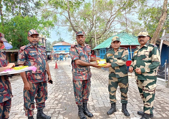 মহান স্বাধীনতা দিবস ও জাতীয় দিবস উপলক্ষে দিনাজপুরে হিলি সীমান্তের ভারতীয় সীমান্তরক্ষি বাহিনী (বিএসএফ) কে মিষ্টি উপহার দিয়ে শুভেচ্ছা জানিয়েছেন বর্ডার গার্ড বাংলাদেশ (বিজিবি) সদস্যরা। আজ মঙ্গলবার বেলা ১১ টায় হিলি সীমান্তের ২৮৫ নম্বর মেইন পিলারের ১১ নম্বর সাব-পিলার সংলগ্ন চেকপোস্ট গেটের শুন্য রেখায় ভারতের বিএসএফের ৬১ ব্যাটালিয়নের হিলি ক্যাম্পের কোম্পানি কমান্ডার যশবীর শিং এর হাতে চার প্যাকেট মিষ্টি তুলে দেন বিজিবির হিলি আইসিপি কোম্পানি কমান্ডার সুবেদার ফজলুর রহমান। এসময় শুন্যরেখায় কর্তব্যরত দু’দেশের পুরুষ ও নারী বিজিবি-বিএসএফের সদস্যরা উপস্থিত ছিলেন। হিলি আইসিপি ক্যাম্প কমান্ডার সুবেদার ফজলুর রহমান বলেন,মহান স্বাধীনতা দিবস ও জাতীয় দিবস উপলক্ষে বিএসএফকে মিষ্টি উপহার দিয়ে শুভেচ্ছা বিনিময় করা হয়েছে। পক্ষান্তরে তারাও এক প্যাকেট মিষ্টি উপহার দিয়ে শুভেচ্ছা জানান। তিনি আরও বলেন,সীমান্তে সৌহার্দ্য-সম্প্রীতি বজায় রেখে দায়িত্ব পালনের লক্ষ্যে দুই দেশের বিভিন্ন ধর্মীয় ও জাতীয় উৎসবগুলোতে বিজিবি ও বিএসএফ একে অপরকে মিষ্টি ও বিভিন্ন সামগ্রী উপহার দিয়ে শুভেচ্ছা জানানো হয়ে থাকে। এতে করে সীমান্তে দায়ীত্ব পালনরত দুই বাহিনীর মাঝে বিরাজমান সুসম্পর্ক আরো সুদৃড় হবে।