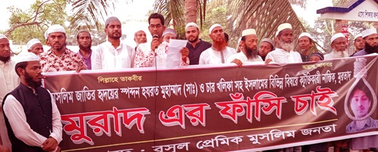 মুসলিম জাতির হৃদয়ের স্পন্দন প্রিয় নবী হযরত মুহাম্মদ (সঃ) ও চার খলিফা সহ ইসলামের বিভিন্ন বিষয়ে কটূক্তির প্রতিবাদে নাস্তিক, মুরতাদ মুরাদ এর ফাঁসির দাবীতে কচুয়ায় প্রতিবাদ সমাবেশ অনুষ্ঠিত হয়েেেছ। মুরাদ কচুয়া বাজারের কম্পিউটার দোকানদার ও কচুয়া উপজেলার মঘিয়া ইউনিয়নের জলিল সেখের ছেলে। ১৪ এপ্রিল বাগেরহাটের কচুয়ায় প্রিয় রসূল প্রেমি মুসলিম জনতার উদ্যোগে বিকাল ৫টায় কচুয়া ডিগ্রি কলেজের সামনে এ প্রতিবাদ সমাবেশ অনুষ্ঠিত হয়। প্রতিবাদ সমাবেশে বক্তব্য দেন হাজরাবাড়ি জামে মসজিদের পেশ ইমাম মুফতি মোঃ মাসুম বিল্লাহ, কচুয়া দাখিল মাদ্রাসার সহ সুপার মাওলানা মাসুম বিল্লাহ, হাফেজ জাকারিয়া, কচুয়া সদর ইউনিয়ন পরিষদের চেয়ারম্যান শিকদার হাদিউজ্জামান সহ বিভিন্ন মসজিদের পেশ ইমাম ও মাদ্রাসার শিক্ষক গন। এ সময় উপস্থিত ছিলেন বিভিন্ন মসজিদের পেশ ইমাম, মাদ্রাসার শিক্ষক, হাফেজ ও রসূল প্রেমি মুসলিম জনতা। এছাড়াও একই দাবিতে কচুয়ার বাধাল বাজর ও বাগেরহাটের দেপাড়া বাজারে আলাদা আলাদা প্রতিবাদ সমাবেশ অনুষ্ঠিত হয়েছে। প্রতিবাদ সমাবেশ থেকে বক্তারা নাস্তিক মুরাদের ফাঁসি সহ মোট ৭ টি দাবি জানান।