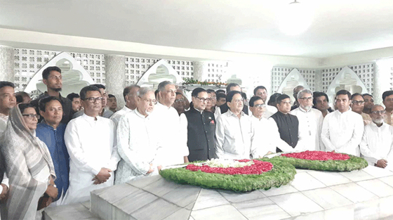 ফুল দেওয়া শেষে কেন্দ্রীয় নেতারা এক মিনিট দাঁড়িয়ে নীরবতা পালন করেন।