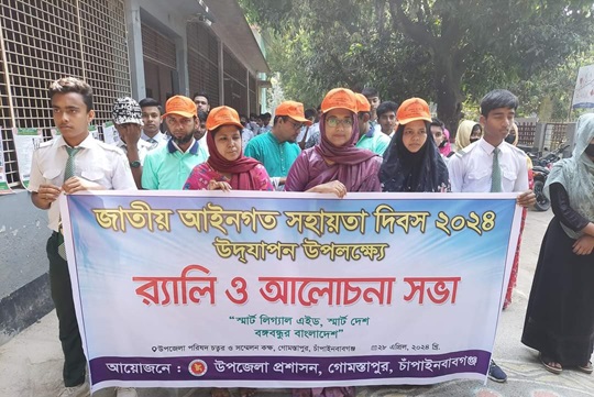 ‘‘স্মার্ট লিগ্যাল এইড, স্মার্ট দেশ বঙ্গবন্ধুর বাংলাদেশ’’ এই প্রতিপাদ্যকে সামনে রেখে চাঁপাইনবাবগঞ্জের গোমস্তাপুরে জাতীয় আইন সহায়তা দিবস পালিত হয়েছে। দিবসটি উপলক্ষে উপজেলা প্রশাসনের আয়োজনে বর্ণাঢ্য শোভাযাত্রা ও আলোচনা সভা অনুষ্ঠিত হয়। রোববার সকালে শোভাযাত্রাটি উপজেলা চত্বর থেকে বের হয়ে ওই এলাকার সড়ক প্রদক্ষিণ করে একই স্থানে এসে শেষ হয়ে। পরে উপজেলা সভাকক্ষে অনুষ্ঠিত আলোচনা সভায় সভাপতিত্ব করেন উপজেলা নির্বাহী অফিসার নিশাত আনজুম অনন্যা। সভায় বক্তব্য দেন উপজেলা প্রকল্প বাস্তবায়ন কর্মকর্তা হাবিবুর রহমান, মহিলা বিষয়ক কর্মকর্তা পঙ্কজ কুমার দাস, উপজেলা মাধ্যমিক শিক্ষা বিভাগের অ্যাকাডেমিক সুপারভাইজার আসমা খাতুন, তথ্য আপা প্রকল্পের সমন্বয়কারী তাকদিরা খাতুনসহ অন্যরা।