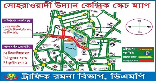 নির্দেশনায় মৎস্য ভবন ক্রসিং, হোটেল ইন্টারকন্টিনেন্টাল ক্রসিং, কাঁটাবন ক্রসিংয়ে ডাইভারশন দেওয়া হবে।