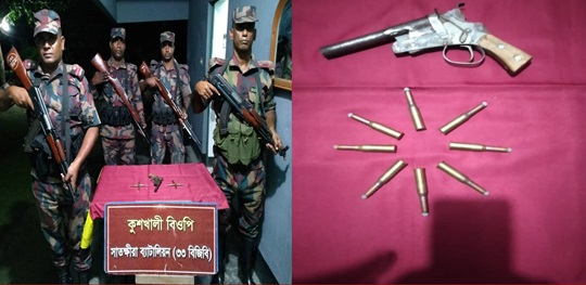 চোরাচালান ও পাচার রোধে সাতক্ষীরা সীমান্ত রেখায় কঠোর নজর রেখেছেন বর্ডার গার্ড বাংলাদেশ-এর সদস্যরা। গত দু’দিনে বিজিবি সদস্যরা ১টি পিস্তল (দেশীয়) ও ৮ রাউন্ড গুলি এবং ৯ কেজি ২০০ গ্রাম ভারতীয় রুপার গহনা আটক করেছেন। বিজিবি জানায়, ১৩ আগস্ট বিকালে সাতক্ষীরা ব্যাটালিয়ন (৩৩ বিজিবি) এর অধিনায়ক লে. কর্নেল মো, আশরাফুল হকের সার্বিক দিক নির্দেশনায় একটি বিশেষ আভিযানিক দল ৯ কেজি ২০০ গ্রাম ভারতীয় রুপার গহনা আটক করে। মাদরা বিওপির দায়িত্বপূর্ণ এলাকার সীমান্ত পিলার ১৩/৩-এস এর ১৪ আরবি হতে ১৫০ গজ বাংলাদেশে অভ্যন্তরে চান্দা নামক স্থান দিয়ে চোরাকারবারীরা রুপার গহনা ভারত হতে বাংলাদেশে পাচারের উদ্দেশ্যে আগমন করবে-এমন সংবাদ প্রাপ্তির পর মাদরা কোম্পানি কমান্ডার সুবেদার কাজী বদরুল আলমের নেতৃত্বে একটি চৌকষ আভিযানিক দল বর্ণিত এলাকায় কৌশলে অবস্থান গ্রহণ করে। এ সময় চোরাকারবারীরা ওই এলাকায় আগমনের পর বিজিবি’র টহল দলের উপস্থিতি বুঝতে পেয়ে রুপার ব্যাগ ফেলে দ্রুত পালিয়ে যায়। পরবর্তীতে আভিযানিক দল চোরাকারবারীর ফেলে যাওয়া ব্যাগ তল্লাশী করে স্কচটেপ দ্বারা মোড়ানো অবস্থায় ৯ কেজি ২০০ গ্রাম ভারতীয় রুপার গহনা উদ্ধার করে। যার আনুমানিক মূল্য তের লক্ষ বায়ান্ন হাজার চারশত টাকা। এ ব্যাপারে কলারোয়া থানায় জিডি (সাধারণ ডায়েরী) করে কোর্ট আদেশ গ্রহণ করতঃ উদ্ধারকৃত রুপার গহনা সাতক্ষীরা ট্রেজারি অফিসে জমা করা হয়। এদিকে, ১২ আগস্ট রাতে বিজিবি’র অভিযানে সাতক্ষীরার কুশখালী বিওপির দায়িত্বপূর্ণ এলাকার সীমান্ত থেকে আসামীবিহীন অস্ত্র ও গোলাবারুদ উদ্ধার করা হয়। বিজিবি জানায়, কুশখালী বিওপি‘র টহল কমান্ডার নায়েব সুবেদার মো. সুলতান মাহমুদ ও হাবিলদার আজমলসহ একটি চৌকষ আভিযানিক দল সীমান্ত পিলার ১২/২-এস হতে আনুমানিক ২০০ গজ বাংলাদেশের অভ্যন্তরে শ্মশান পোস্ট নামক স্থানে বিশেষ অভিযান পরিচালনা করেন। গোয়েন্দা তথ্যের ভিত্তিতে কুশখালী সীমান্ত দিয়ে ভারত হতে বাংলাদেশে অস্ত্র পাচারের তথ্য পাওয়া যায়। ওই তথ্যের আলোকে আভিযানিক দলটি পূর্ব থেকে ওই এলাকায় অবস্থান গ্রহণ করে। একপর্যায়ে আভিযানিক দলের উপস্থিতি টের পেয়ে অস্ত্র চোরাকারবারীরা পলায়নে উদ্যত হলে অভিযানিক দল তাদের ধাওয়া করে। এ সময় রাতের অন্ধকারে ঘন বন দিয়ে চোরাকারবারীরা পালিয়ে যায়। পরবর্তীতে আভিযানিকদল ওই এলাকা তল্লাশী করে ১টি পিস্তল (দেশীয়) ও ৮রাউন্ড গুলি উদ্ধার করে। যার আনুমানিক মূল্য এগার হাজার ছয়শত টাকা। এ ব্যাপারে সাতক্ষীরা সদর থানায় সাধারণ ডায়রী করে জমা করা হয়েছে। ৩৩ বিজিবির অধিনায়ক লে. কর্নেল মো. আশরাফুল হক এসব ঘটনার সত্যতা নিশ্চিত করেছেন।