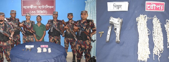 সাতক্ষীরার কলারোয়া উপজেলায় কাকডাংগা সীমান্তে বিজিবির অভিযানে অস্ত্র-গোলাবারুদ ও রুপার গহনাসহ একজন আটক হয়েছে। আটক ব্যক্তির নাম মোঃ তরিকুল ইসলাম (৪০)। তিনি সাতক্ষীরার কলারোয়া উপজেলার দক্ষিণ ভাদিয়ালি গ্রামের মৃত-লুৎফর রহমানের ছেলে। এ সময় পালিয়ে গেছে তরিকুল ইসলামের সহযোগী মোঃ আবদুল গফ্ফার (৪৫)। পলাতক আবদুল গফফার একই উপজেলার পূর্ব ভাদিয়ালি গ্রামের মৃত আবদুল আজিজের ছেলে। সাতক্ষীরা বিজিবি ৩৩ ব্যাটালিয়নের পরিচালক ও অধিনায়ক আশরাফুল হক (পিবিজিএম, পিএসসি, জি) এক বার্তায় বিষয়টি নিশ্চিত করে জানান, আটককৃত অস্ত্রের মধ্যে রয়েছে ০১টি বিদেশী পিস্তল (কপি, মেইড ইন ইউএসএ নামাঙ্কিত), ০৩ রাউন্ড গুলি, ০১টি ম্যাগাজিন। এ ছাড়া ১.৯৯৫ কেজি রুপার গহনা আটক করা হয়েছে ওই অভিযানে। অধিনায়ক আশরাফুল হক জানান, শুক্রবার (২৩ আগস্ট ২০২৪) প্রথম প্রহরে রাত ২টার দিকে তাঁর সার্বিক দিক নির্দেশনায় একটি বিশেষ আভিযানিকদল একজন আসামীসহ ০১টি বিদেশী পিস্তল (কপি, মেইড ইন ইউএসএ নামাঙ্কিত), ০৩ রাউন্ড গুলি, ০১টি ম্যাগাজিন এবং ১.৯৯৫ কেজি রুপার গহনা আটক করা হয়েছে। গোয়েন্দা তথ্যের ভিত্তিতে জানা যায় যে, সাতক্ষীরাস্থ কাকডাঙ্গা বিওপির দায়িত্বাধীন সীমান্ত পিলার ১৩/৩-এস এর ৭ আরবি হতে আনুমানিক ১০০ গজ বাংলাদেশের অভ্যন্তরে দক্ষিণ ভাদিয়ালী এলাকা দিয়ে অস্ত্র-গোলাবারুদ ও রুপা বাংলাদেশে পাঁচারের উদ্দেশ্যে আগমন করবে-এমন সংবাদ প্রাপ্তির পর কাকডাঙ্গা বিওপির নায়েব সুবেদার মোঃ আবু তাহের পাটোয়ারীর নেতৃত্বে একটি চৌকষ আভিযানিকদল ওই স্থানে কৌশলে অবস্থান গ্রহণ করে। এ সময় আভিযানিকদল ওই স্থান হতে বাংলাদেশী নাগরিক মোঃ তরিকুল ইসলাম (৪০)কে আটক করে এবং তাঁর সহযোগী মোঃ আবদুল গফ্ফার (৪৫) পালিয়ে যায়। পরবর্তীতে আটককৃত তরিকুল ইসলামকে তল্লাশী করে তার ব্যাগে রক্ষিত ০১টি বিদেশী পিস্তল (কপি, মেইড ইন ইউএসএ নামাঙ্কিত), ০৩ রাউন্ড গুলি, ০১টি ম্যাগাজিন ও ১.৯৯৫ কেজি ভারতীয় রুপার গহনা উদ্ধার করা হয়। বিজিবির প্রাথমিক জিজ্ঞাসাবাদে আটক তরিকুল ইসলাম জানায় তাঁর বিরুদ্ধে কলারোয়া থানায় ৪টি মাদক মামলা রয়েছে। এ ছাড়া পলাতক আবদুল গফফারের বিরুদ্ধে ০২টি অস্ত্র মামলা রয়েছে। এ ঘটনায় কলারোয়া থানায় মামলা দায়ের করতঃ আটককৃত ব্যক্তি ও অস্ত্র-গোলাবারুদ থানায় হস্তান্তর এবং রুপার গহনা সাতক্ষীরা ট্রেজারী অফিসে জমা দেওয়া হয়েছে বলে জানান সাতক্ষীরা বিজিবি ৩৩ ব্যাটালিয়নের পরিচালক ও অধিনায়ক আশরাফুল হক।