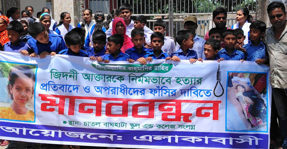 গৃহকর্মী জিদনী আক্তারকে (১১) শারীরিক ও মানসিক নির্যাতন করে নির্মম ভাবে হত্যার প্রতিবাদে কিশোরগঞ্জের কটিয়াদীতে মুমুরদিয়া এলাকাবাসী ও চাতল বাগহাটা স্কুল এ- কলেজের ছাত্র ছাত্রী, শিক্ষক, অভিভাবক ঘন্টা ব্যাপী এক মানববন্ধন কর্মসূচি পালন করে।