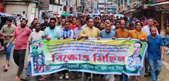 গোপালগঞ্জে যাওয়ার পথে স্বেচ্ছাসেবকদলের কেন্দ্রীয় সভাপতি এস এম জিলানীর উপর আওয়ামী লীগ কর্তৃক হামলার ঘটনার প্রতিবাদ ও ক্রীড়া সম্পাদক শওকত আলী দিদার নিহতের ঘটনার প্রতিবাদে টাঙ্গাইলে জেলা সেচ্ছাসেবকদল বিক্ষোভ মিছিল করেছে।