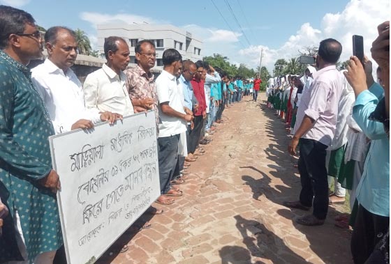 আশাশুনি উপজেলার ঐতিহ্যবাহী মাড়িয়ালা মাধ্যমিক বিদ্যালয়ের নামে রেকর্ডীয় ৪ বিঘা সম্পত্তি দীর্ঘ ৬৩ বছর যাবৎ অবৈধ দখলকারীদের কবল থেকে উদ্ধার ও স্কুলের খেলার মাঠ করার দাবী জানিয়ে মানববন্ধন করা হয়েছে। সোমবার (৭ অক্টোবর) স্কুল টিফিনের সময় শিক্ষক-কর্মচারি ও ছাত্রছাত্রীদের অংশগ্রহণে স্কুলের সামনের সড়কে এ মানববন্ধন অনুষ্ঠিত হয়।