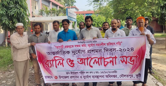 কুষ্টিয়ার দৌলতপুর উপজেলা প্রশাসন ও দুর্যোগ ব্যবস্থাপনা অধিদপ্তরের উদ্যোগে রোববার সকাল দশটায় আন্তর্জাতিক দুর্যোগ মুসলমান দিবস পালিত হয়েছে। দৌলতপুর উপজেলা পরিষদ মিলনায়তনে এসিল্যান্ড মোঃফয়সাল আহমেদ এর সভাপতিত্বে দিবসটির তাৎপর্য তুলে ধরে উপস্থিত থেকে বক্তব্য রাখেন দৌলতপুর উপজেলা প্রকল্প বাস্তবায়ন কর্মকর্তা মোঃ আবদুল হান্নান,এলজিইডির উপসহকারী প্রকৌশলী মোহাম্মদ শামীম আলম, উপসহকারী প্রকৌশলী পাট উন্নয়নএর এ,বি,এম, কামাল হোসেন,আলিফ নগর ইউনিয়ন পরিষদের প্রশাসনিক কর্মকর্তা মোঃ রাশেদুল ইসলাম। অনুষ্ঠানের সরকারি কর্মকর্তা সহ অন্যান্য ব্যক্তিবর্গ উপস্থিত ছিলেন। এর আগে ব্যানারসহ একটি র্যালি বের করা হয়।